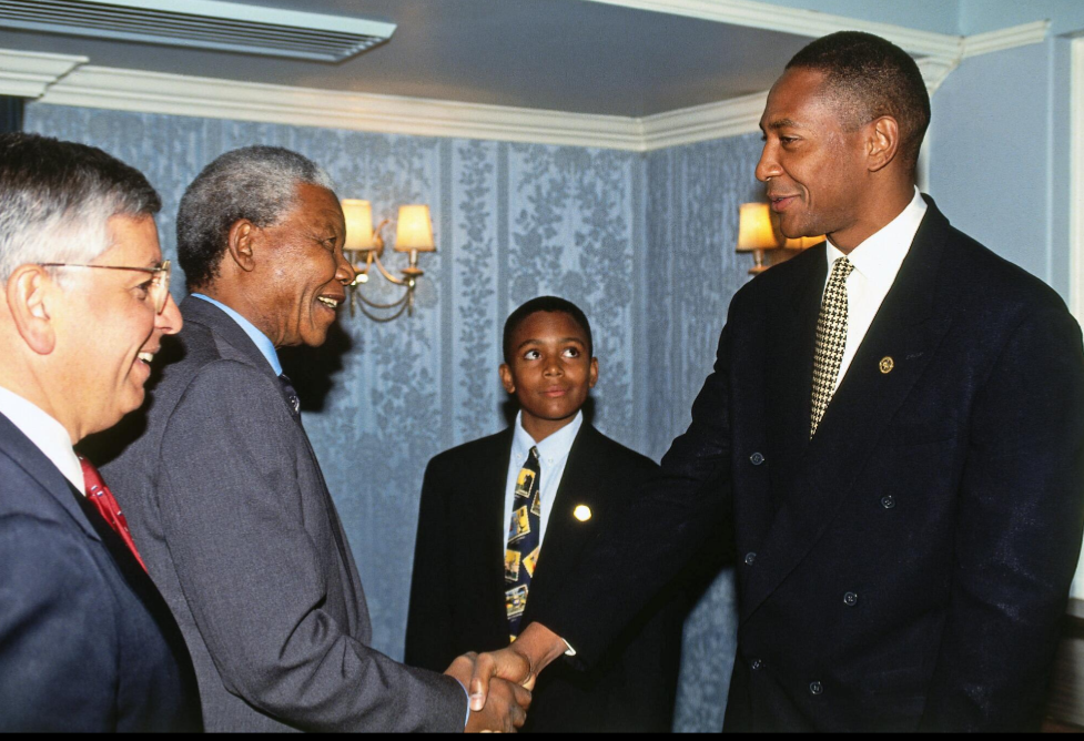 Former Nuggets star Alex English, right, meets South Africa president Nelson Mandela, with NBA commissioner David Stern left and son Alex Jr. in 1993. (Photo courtesy of NBA)