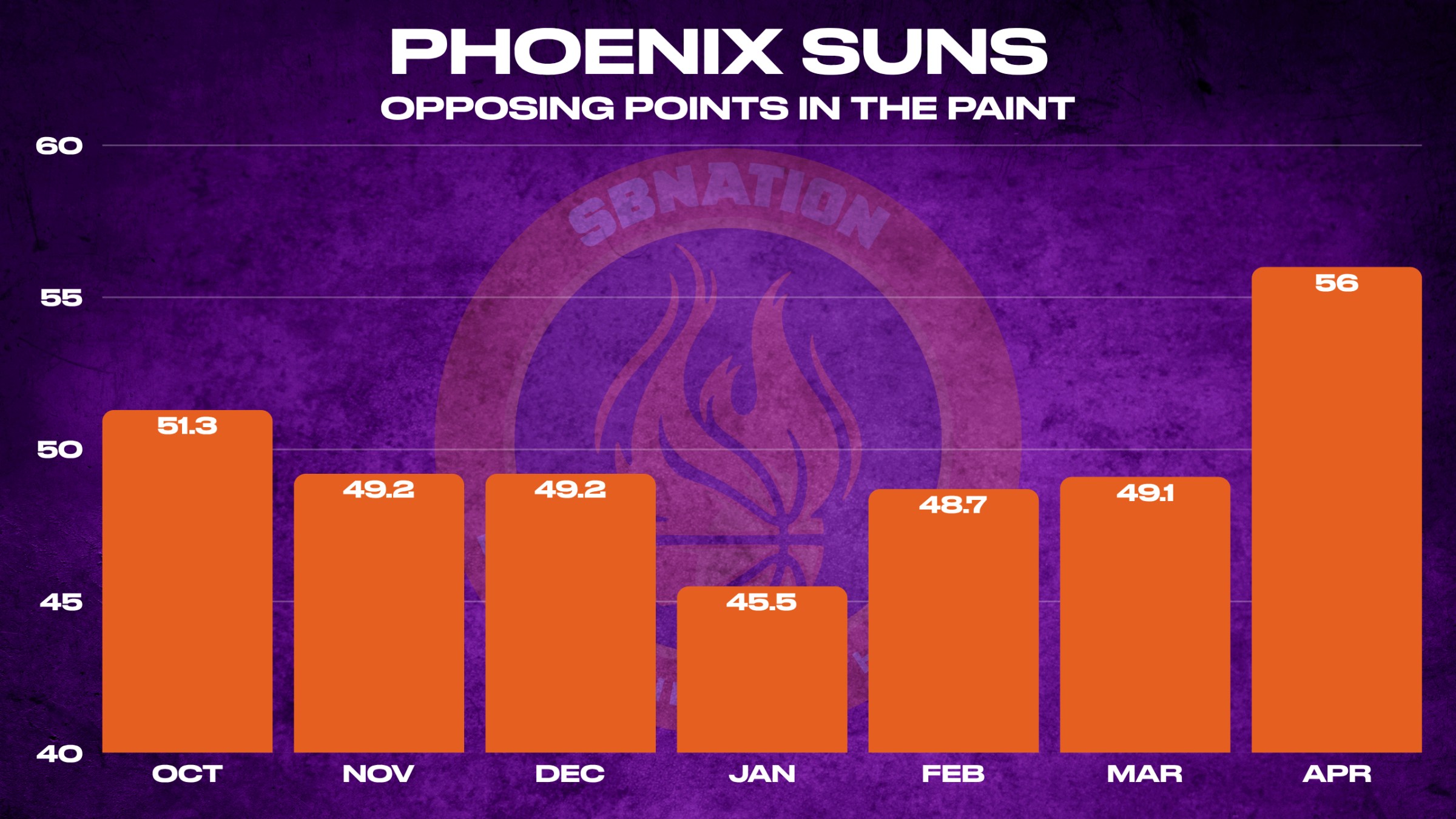 We talked about it in the Weekly Recap, and the numbers keep reinforcing it. Month by month, Phoenix is allowing more damage in the paint, not less. They are allowing 56.0 points in the paint in April, whereas they were permitting 48.5 during the first six months of the year. An extra 8 points nightly is not what anyone would label as “ideal”. That is the wrong direction this time of year. You already know why it matters. The paint is where the highest percentage shots live. Layups, dunks, second-chance looks; all of it adds up quickly when you do not protect that space.
