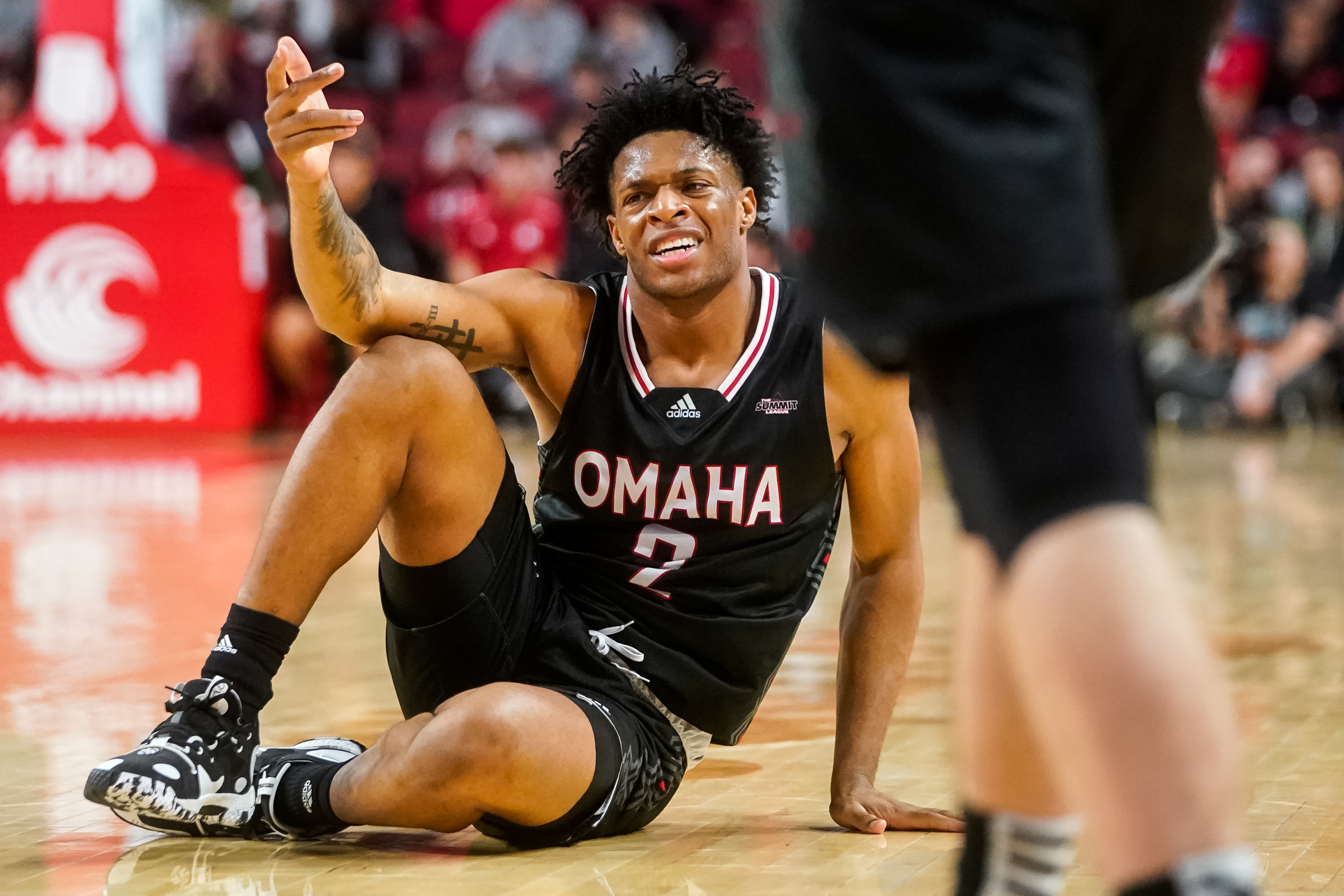 Nov 10, 2022; Lincoln, Nebraska, USA; Nebraska-Omaha Mavericks guard Jaeden Marshall (2) reacts after a three-point basket during the second half against the Nebraska Cornhuskers at Pinnacle Bank Arena. Mandatory Credit: Dylan Widger-Imagn Images