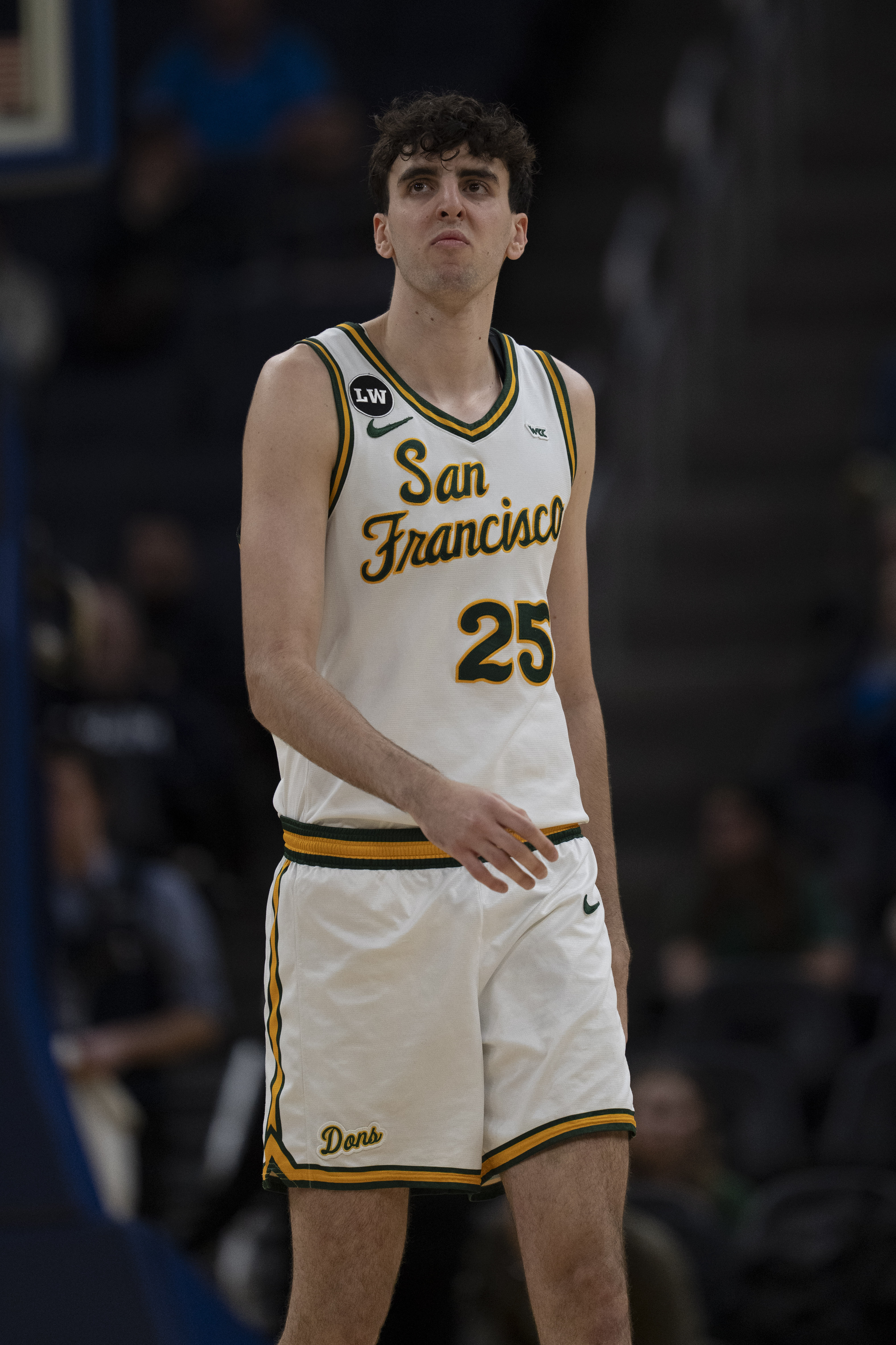Feb 18, 2026; San Francisco, California, USA; San Francisco Dons forward Guillermo Diaz Graham (25) during the first half against the Gonzaga Bulldogs at Chase Center. Mandatory Credit: Stan Szeto-Imagn Images