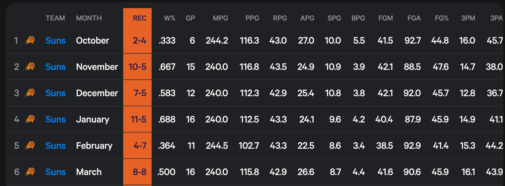 The Suns have locked in the 7th seed and will host the Clippers or Blazers on April 14th at the Mortgage Matchup Center. Now, let’s take a quick look at how we got here in a more zoomed-out perspective, month by month.