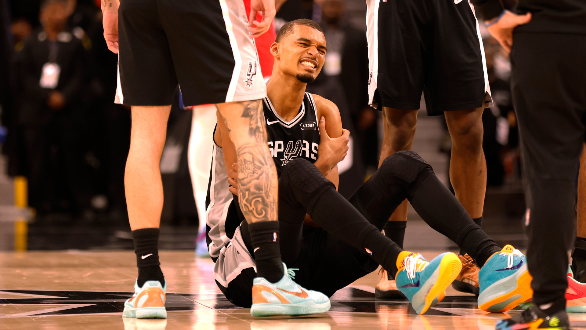GettyVictor Wembanyama #1 of the San Antonio Spurs grabs his left arm after an injury during game against the Philadelphia 76ers in the first half at Frost Bank Center on April 6, 2026 in San Antonio, Texas.