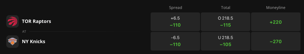 Looking at the odds for tonight, the Knicks enter as 6.5-point favorites on DraftKings Sportsbook. The Raptors are +220 underdogs with the game total set at O/U 218.5 points.