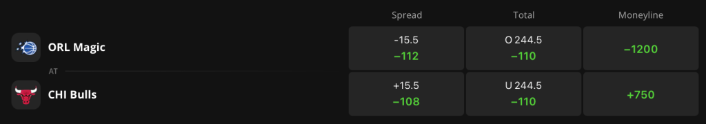 The Magic enter as hefty 15.5-point favorites on DraftKings Sportsbook. The Bulls sit as a +750 underdog, with the game total set at 244.5 points.