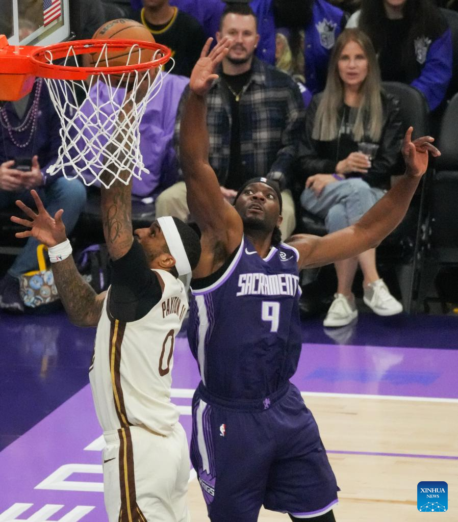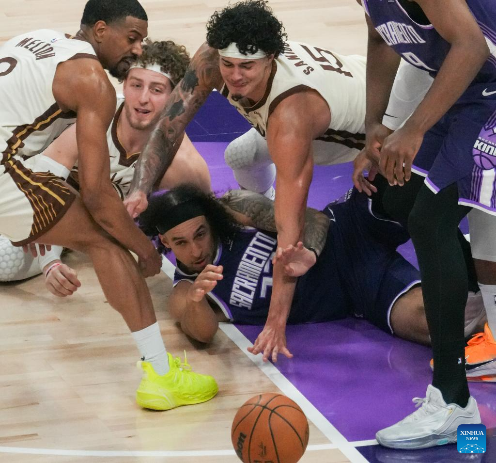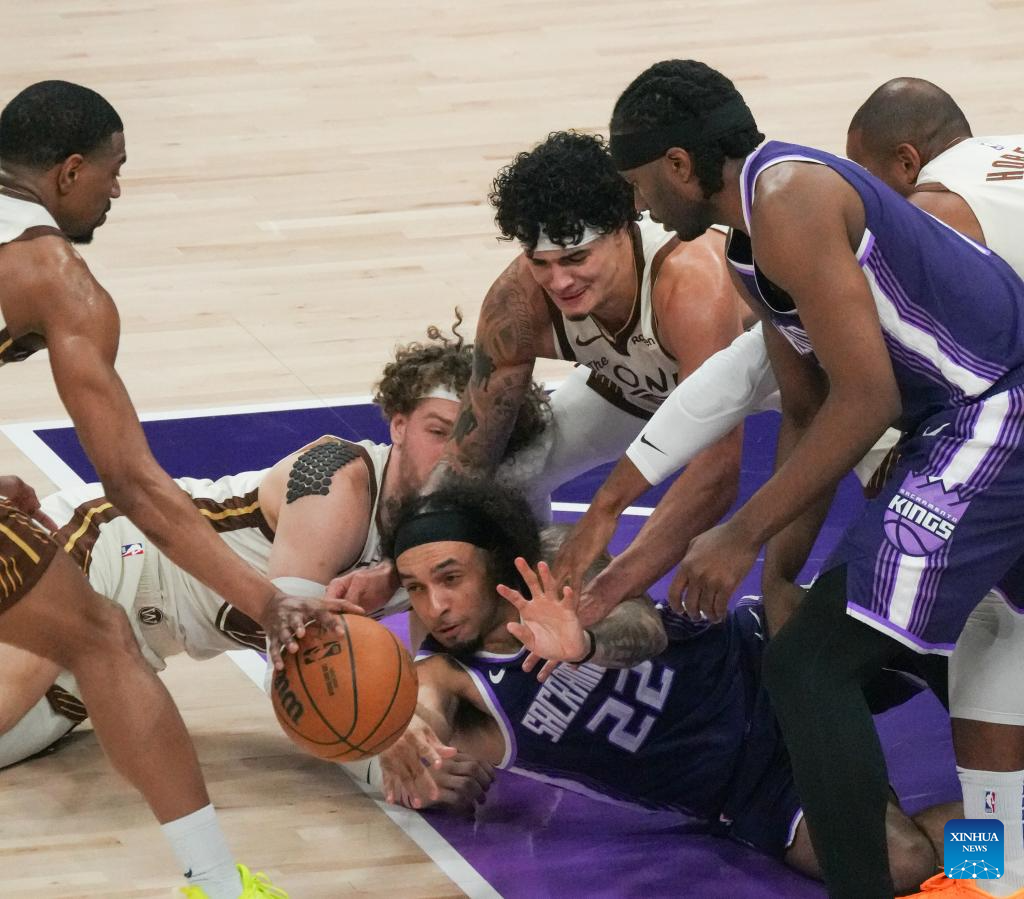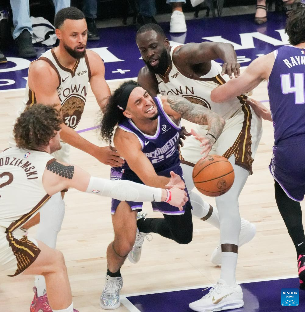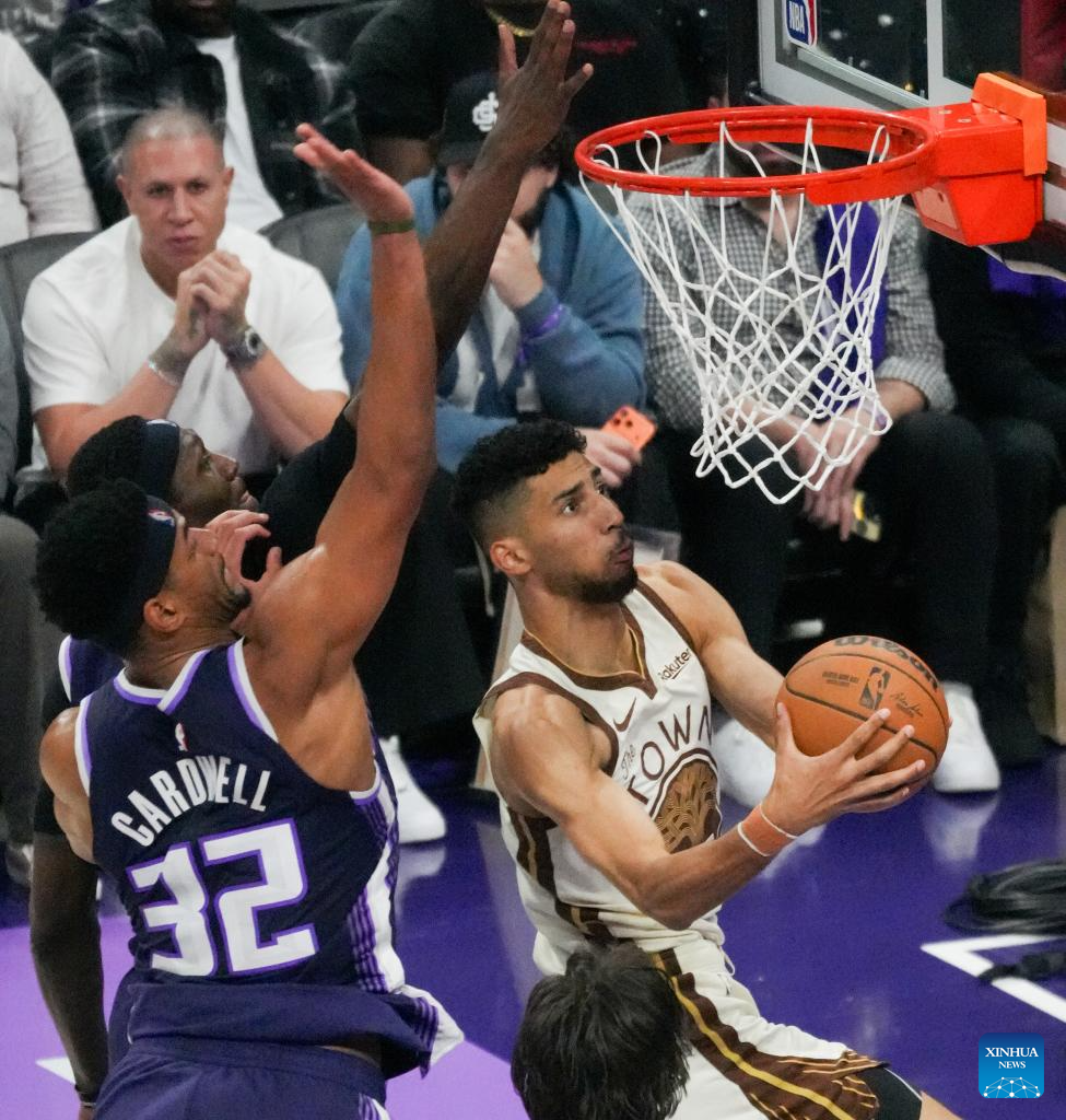 Devin Carter (C) of Sacramento Kings is fouled during the 2025-2026 NBA regular season game between Sacramento Kings and Golden State Warriors in Sacramento, the United States, April 10, 2026. (Photo by Sun Yuxuan/Xinhua)