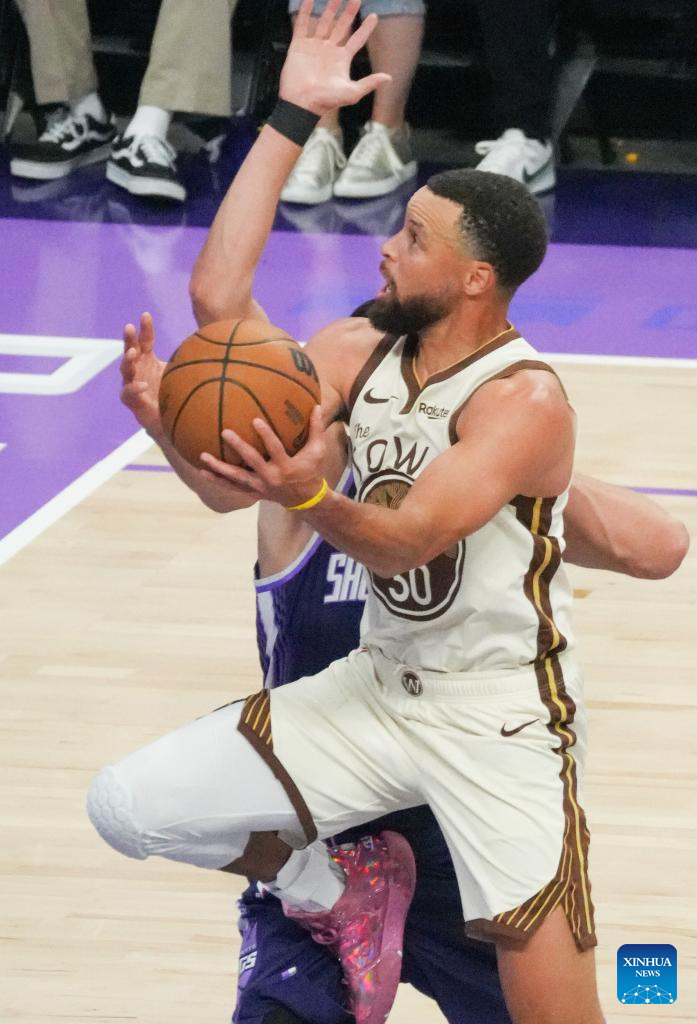 Stephen Curry (front) of Golden State Warriors goes for a layup during the 2025-2026 NBA regular season game between Sacramento Kings and Golden State Warriors in Sacramento, the United States, April 10, 2026. (Photo by Sun Yuxuan/Xinhua)