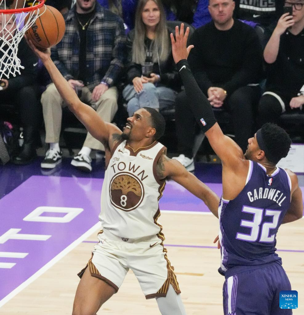 De’Anthony Melton (L) of Golden State Warriors goes for a layup during the 2025-2026 NBA regular season game between Sacramento Kings and Golden State Warriors in Sacramento, the United States, April 10, 2026. (Photo by Sun Yuxuan/Xinhua)
