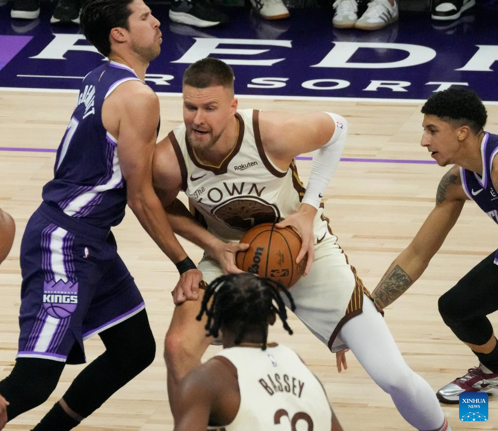 Kristaps Porzingis (C) of Golden State Warriors competes during the 2025-2026 NBA regular season game between Sacramento Kings and Golden State Warriors in Sacramento, the United States, April 10, 2026. (Photo by Sun Yuxuan/Xinhua)