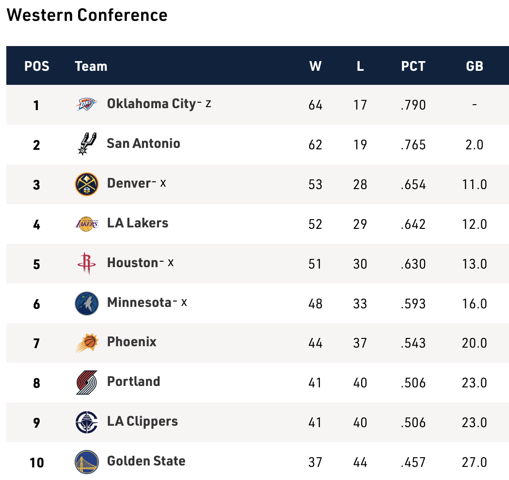 Hence, it would behoove both the Denver Nuggets and Los Angeles Lakers to secure the third seed and avoid OKC until a potential Conference Finals showdown and line up a second-round series with San Antonio instead.