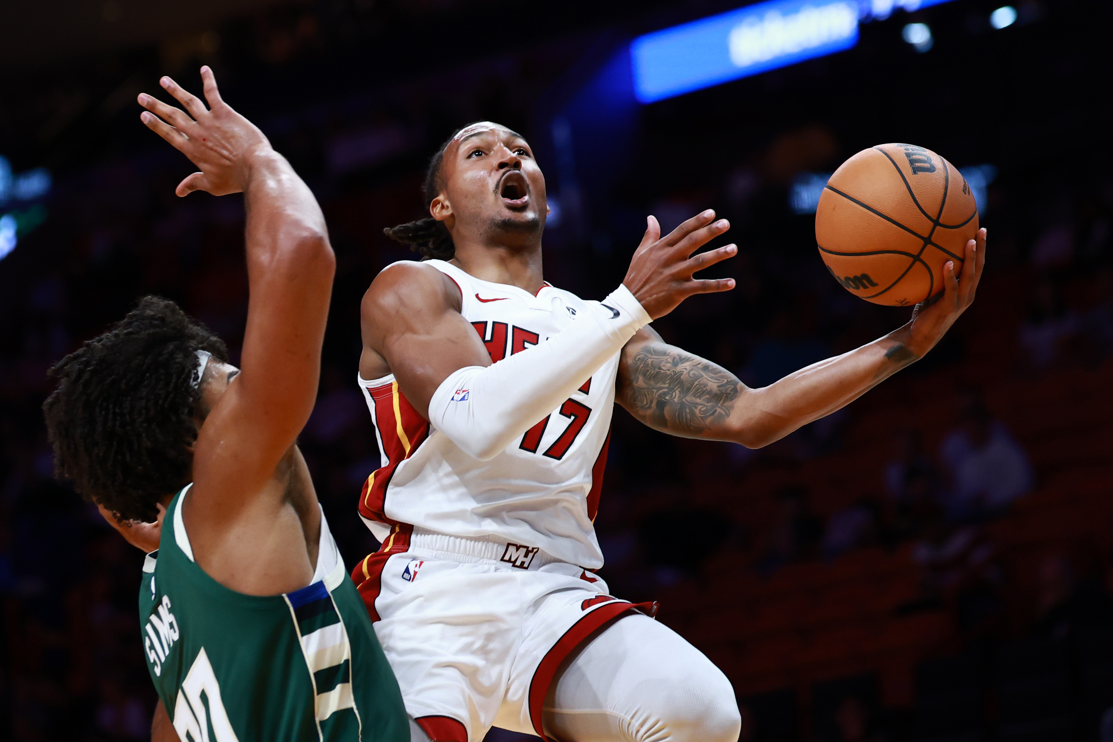 GettyJahmir Young of the Miami Heat drives to the net against Jericho Sims #00 of the Milwaukee Bucks during the second half at Kaseya Center on October 06, 2025 in Miami, Florida.