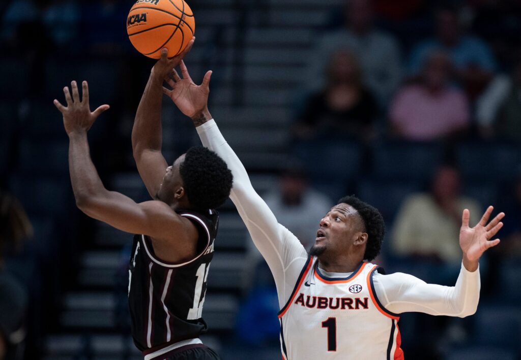 Mississippi State guard Josh Hubbard (12) is guarded on a shot by Auburn guard Kevin Overton (1) during their 2026 SEC Men’s Basketball Tournament game at Bridgestone Arena in Nashville, Tenn., Wednesday, March 11, 2026.