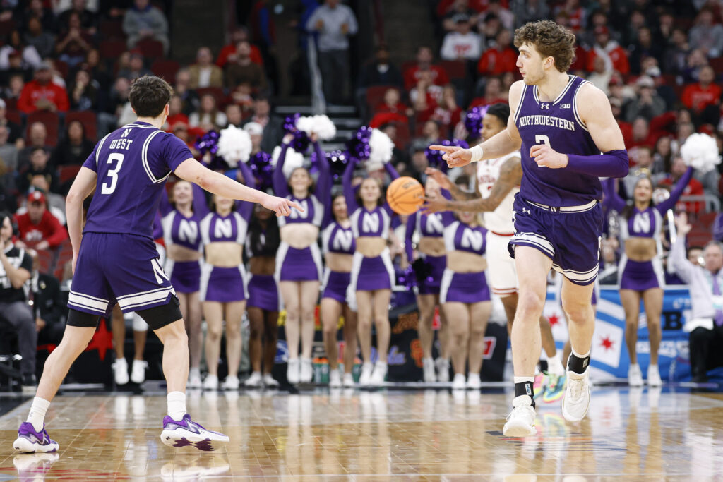 Mar 11, 2026; Chicago, IL, USA; Northwestern Wildcats forward Nick Martinelli (2) reacts after scoring against the Indiana Hoosiers during the second half at United Center. Mandatory Credit: Kamil Krzaczynski-Imagn Images