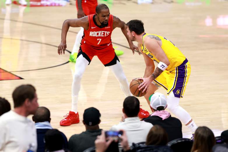 GettyHOUSTON, TEXAS – MARCH 16: Kevin Durant #7 of the Houston Rockets defends Luka Doncic #77 of the Los Angeles Lakers during the third quarter of the game at Toyota Center on March 16, 2026 in Houston, Texas. (Photo by Kenneth Richmond/Getty Images)