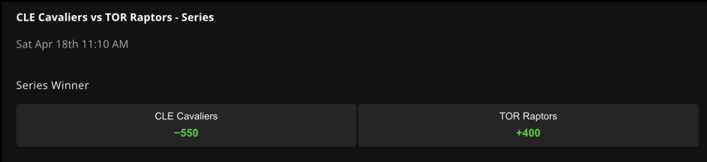 The Cavaliers are -550 to win the series, while the Raptors are +400 underdogs on DraftKings Sportsbook.