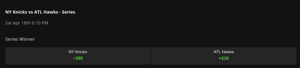 The Knicks are -290 to win the series, while the Hawks are +230 underdogs on DraftKings Sportsbook.