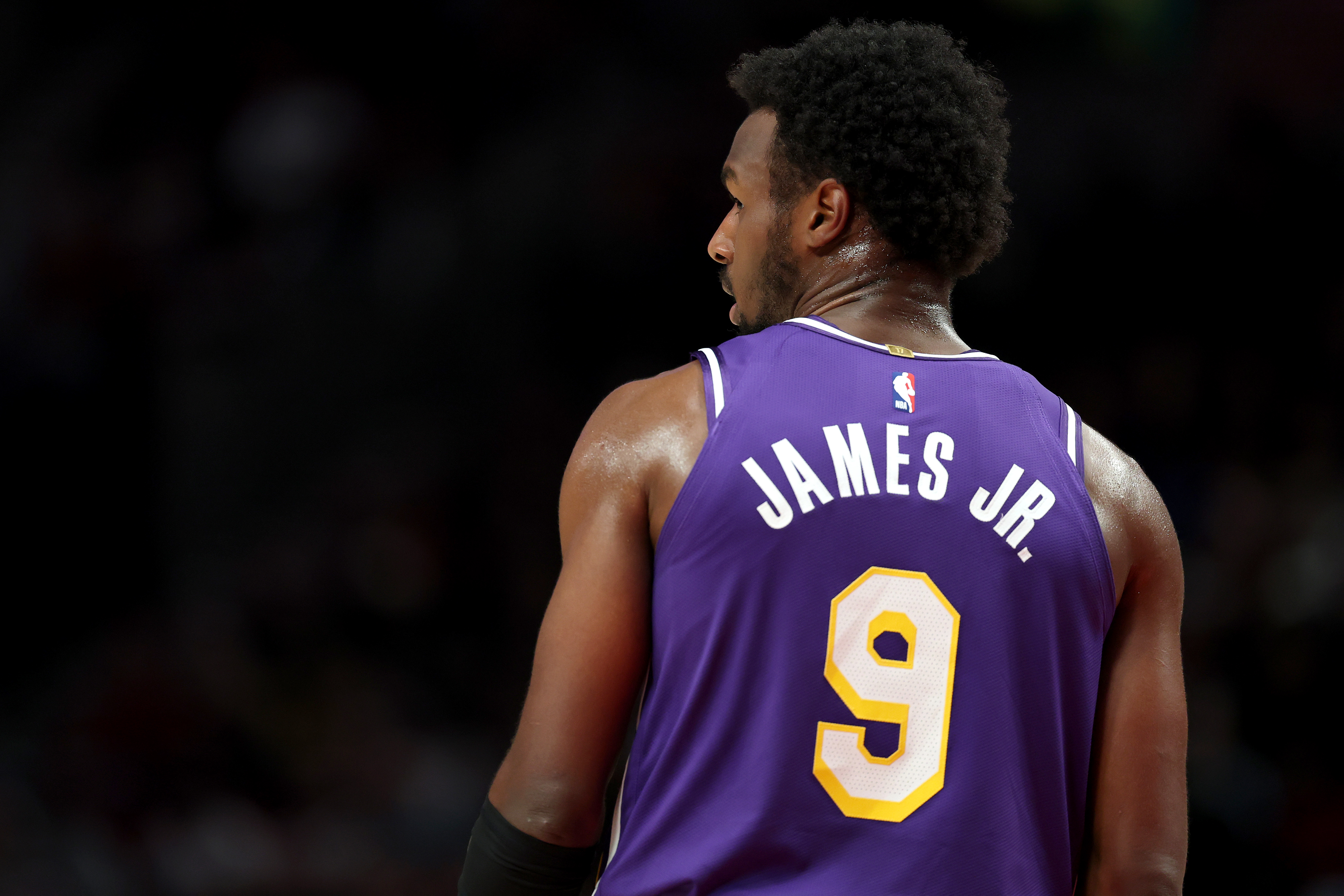 GettyBronny James #9 of the Los Angeles Lakers looks on against the Portland Trail Blazers during the first half at Moda Center on November 03, 2025 in Portland, Oregon.