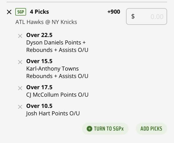 If you’re building a SGP (Same Game Parlay) for Game 1, adding in McCollum to get at least 18 points boosts the odds up to a solid +900 for the four Knicks-Hawks bets in this post.