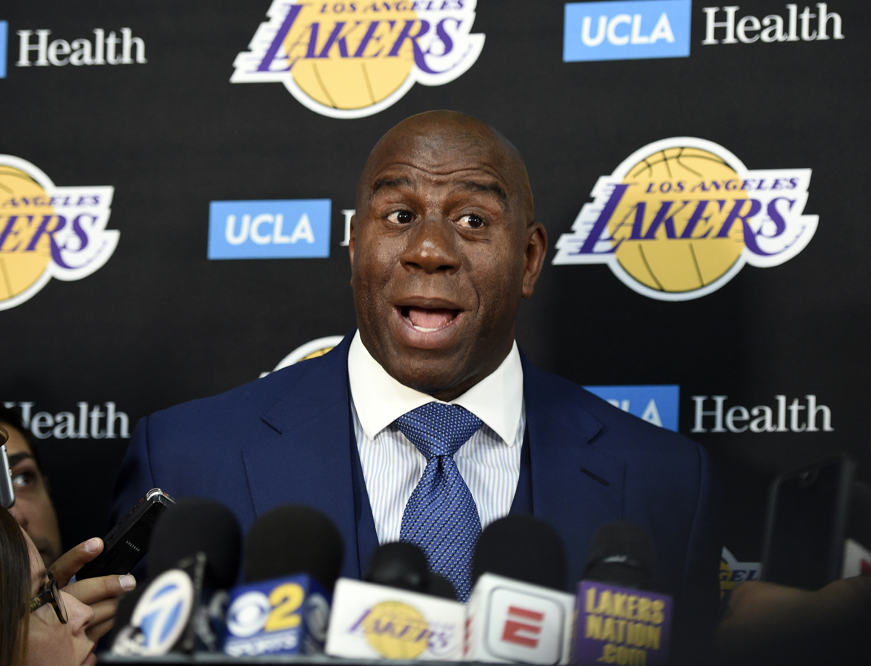 GettyEarvin “Magic” Johnson, president of basketball operations of the Los Angeles Lakers, speaks during media day September 25, 2017, in El Segundo, California.