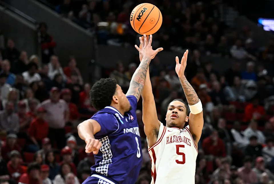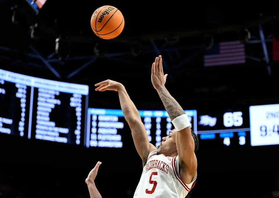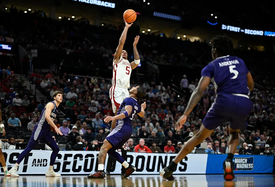 Mar 21, 2026; Portland, OR, USA; Arkansas Razorbacks guard Darius Acuff Jr. (5) shoots in the second half against the High Point Panthers during a second round game of the men’s 2026 NCAA Tournament at Moda Center. Mandatory Credit: Troy Wayrynen-Imagn Images