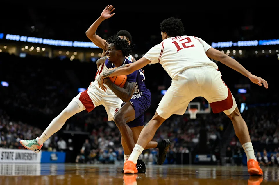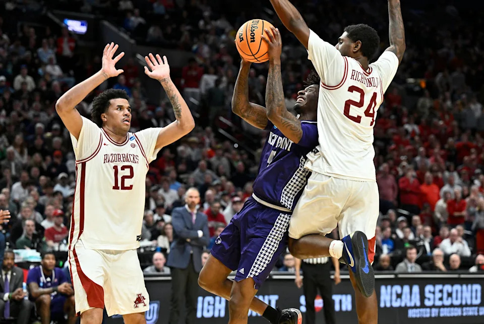 Mar 21, 2026; Portland, OR, USA; High Point Panthers forward Terry Anderson (5) drives against Arkansas Razorbacks forward Malique Ewin (12) and forward Billy Richmond III (24) in the second half during a second round game of the men’s 2026 NCAA Tournament at Moda Center. Mandatory Credit: Craig Strobeck-Imagn Images