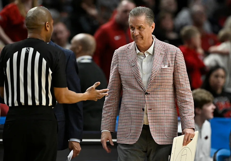Mar 21, 2026; Portland, OR, USA; Arkansas Razorbacks head coach John Calipari talks to an official in the second half against the High Point Panthers during a second round game of the men’s 2026 NCAA Tournament at Moda Center. Mandatory Credit: Craig Strobeck-Imagn Images