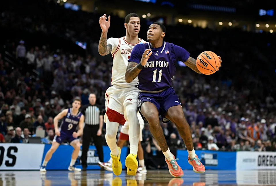 Mar 21, 2026; Portland, OR, USA; High Point Panthers forward Cam’ron Fletcher (11) drives against Arkansas Razorbacks forward Trevon Brazile (7) in the first half during a second round game of the men’s 2026 NCAA Tournament at Moda Center. Mandatory Credit: Troy Wayrynen-Imagn Images
