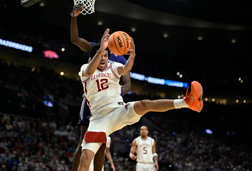 Mar 21, 2026; Portland, OR, USA; Arkansas Razorbacks forward Malique Ewin (12) rebounds in front of forward Trevon Brazile (7) in the first half against the High Point Panthers during a second round game of the men’s 2026 NCAA Tournament at Moda Center. Mandatory Credit: Troy Wayrynen-Imagn Images