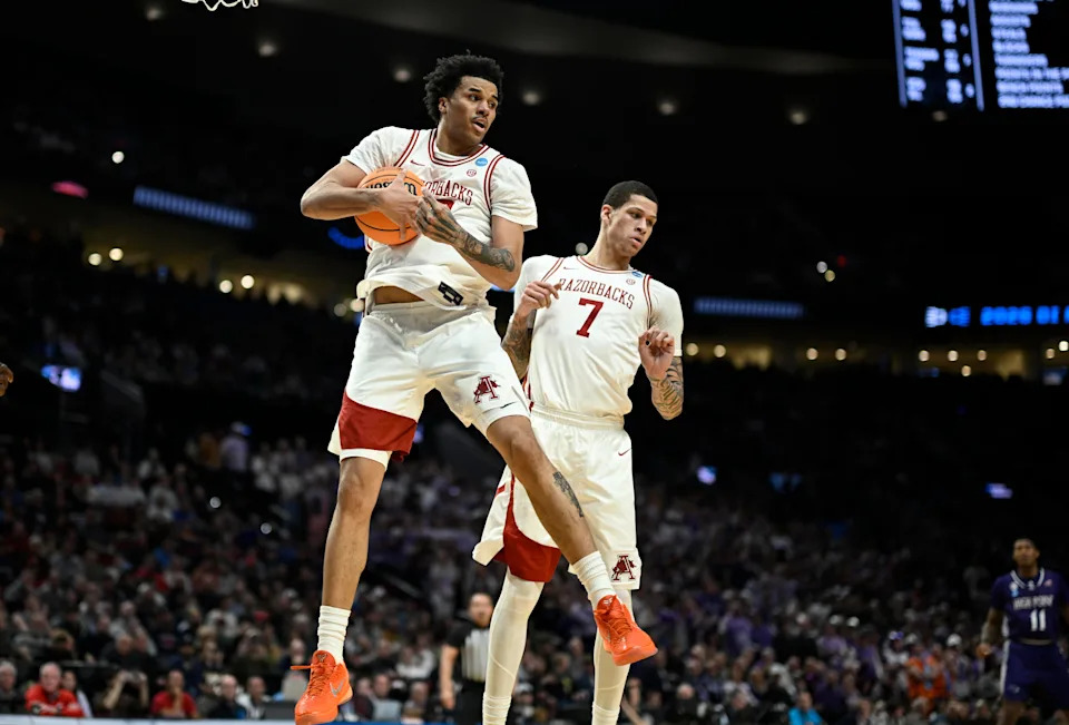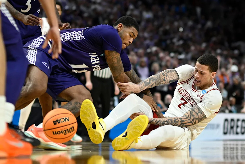 Mar 21, 2026; Portland, OR, USA; Arkansas Razorbacks forward Trevon Brazile (7) and High Point Panthers forward Cam’ron Fletcher (11) fight for a loose ball in the second half during a second round game of the men’s 2026 NCAA Tournament at Moda Center. Mandatory Credit: Troy Wayrynen-Imagn Images