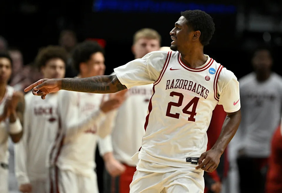 Mar 21, 2026; Portland, OR, USA; Arkansas Razorbacks forward Billy Richmond III (24) reacts after a play in the second half against the High Point Panthers during a second round game of the men’s 2026 NCAA Tournament at Moda Center. Mandatory Credit: Craig Strobeck-Imagn Images