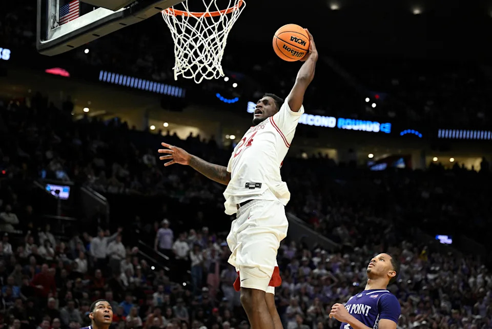 Mar 21, 2026; Portland, OR, USA; Arkansas Razorbacks forward Billy Richmond III (24) dunks against High Point Panthers guard Rob Martin (3) in the second half during a second round game of the men’s 2026 NCAA Tournament at Moda Center. Mandatory Credit: Troy Wayrynen-Imagn Images