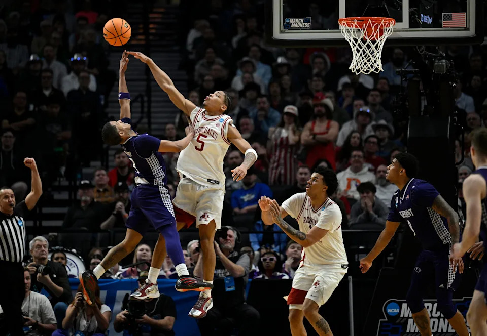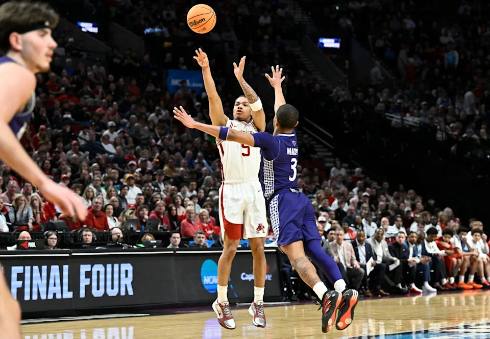 Mar 21, 2026; Portland, OR, USA; Arkansas Razorbacks guard Darius Acuff Jr. (5) shoots against High Point Panthers forward Terry Anderson (5) in the second half during a second round game of the men’s 2026 NCAA Tournament at Moda Center. Mandatory Credit: Troy Wayrynen-Imagn Images