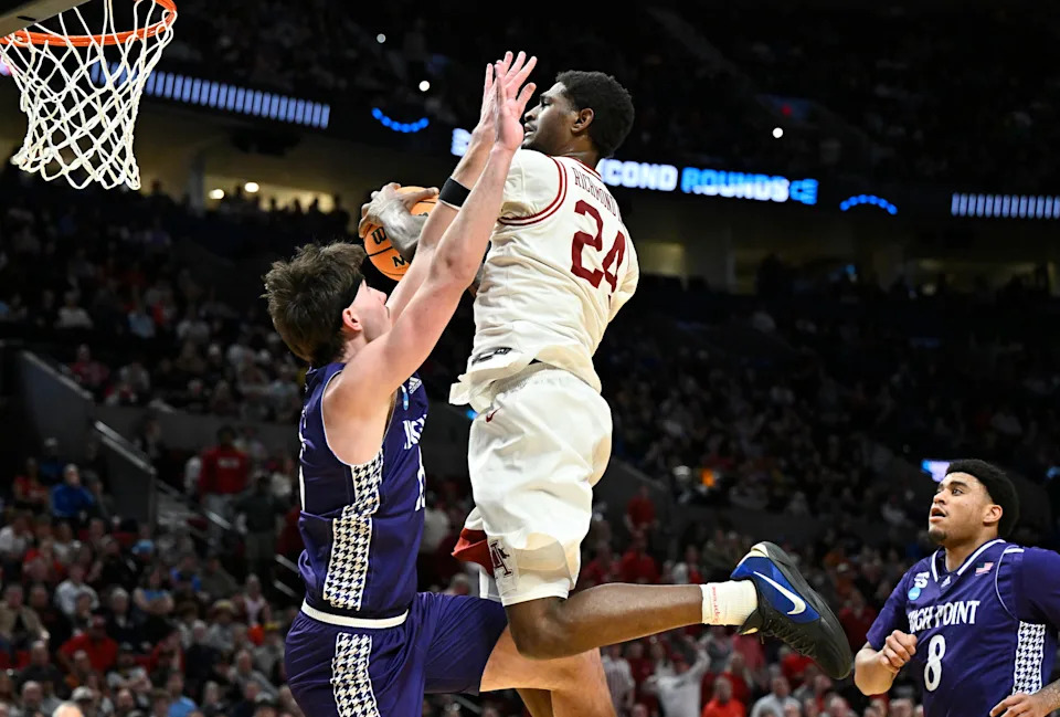 Mar 21, 2026; Portland, OR, USA; Arkansas Razorbacks forward Billy Richmond III (24) drives against High Point Panthers guard Vincent Brady II (2) in the first half during a second round game of the men’s 2026 NCAA Tournament at Moda Center. Mandatory Credit: Craig Strobeck-Imagn Images