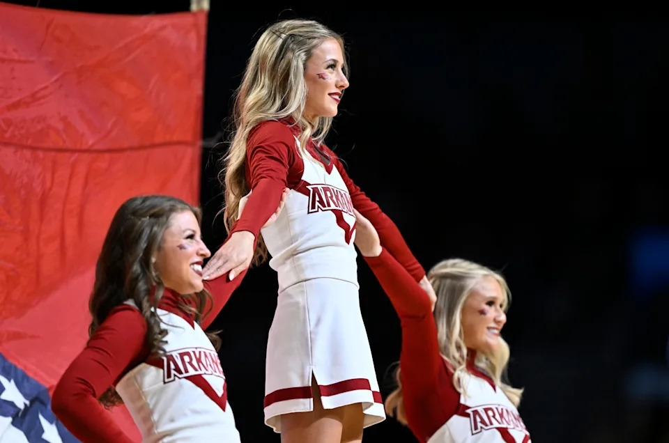 Mar 21, 2026; Portland, OR, USA; Arkansas Razorbacks cheerleaders in the second half against the High Point Panthers during a second round game of the men’s 2026 NCAA Tournament at Moda Center. Mandatory Credit: Craig Strobeck-Imagn Images