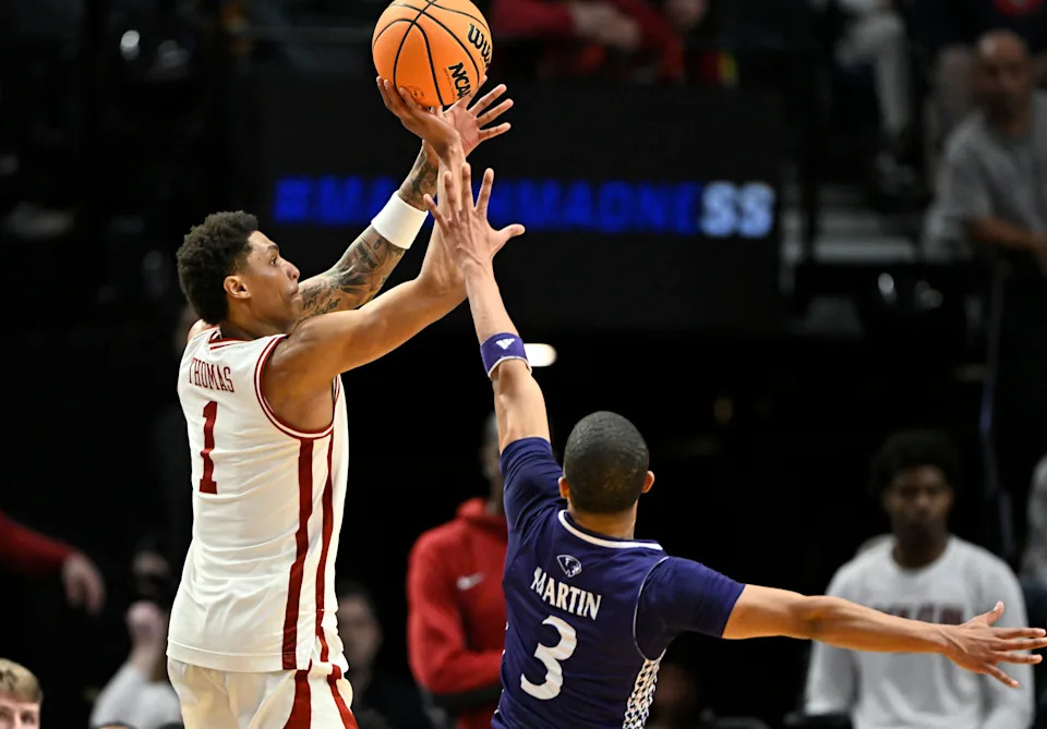 Mar 21, 2026; Portland, OR, USA; Arkansas Razorbacks guard Meleek Thomas (1) shoots against High Point Panthers forward Terry Anderson (5) in the second half during a second round game of the men’s 2026 NCAA Tournament at Moda Center. Mandatory Credit: Troy Wayrynen-Imagn Images