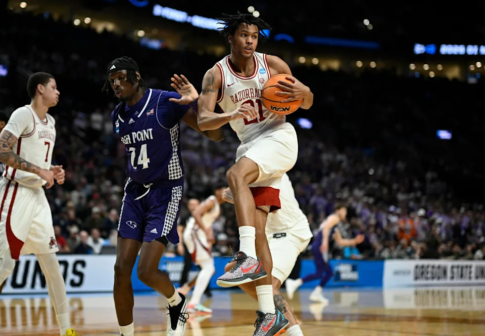 Mar 21, 2026; Portland, OR, USA; Arkansas Razorbacks guard D.J. Wagner (21) rebounds against High Point Panthers center Youssouf Singare (24) in the first half during a second round game of the men’s 2026 NCAA Tournament at Moda Center. Mandatory Credit: Troy Wayrynen-Imagn Images