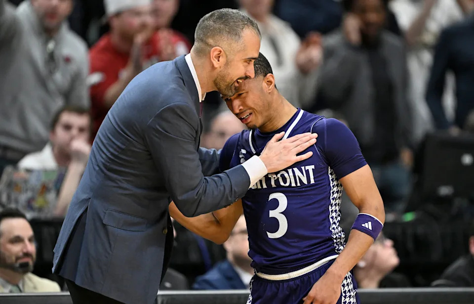 Mar 21, 2026; Portland, OR, USA; High Point Panthers head coach Flynn Clayman and guard Rob Martin (3) react in the second half against the Arkansas Razorbacks during a second round game of the men’s 2026 NCAA Tournament at Moda Center. Mandatory Credit: Craig Strobeck-Imagn Images