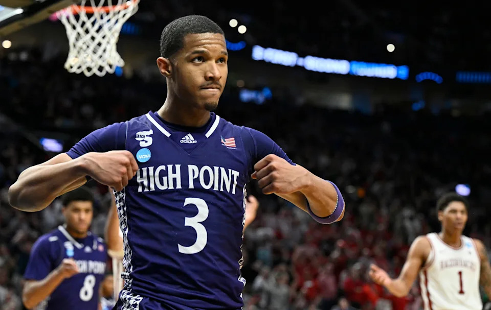 Mar 21, 2026; Portland, OR, USA; High Point Panthers guard Rob Martin (3) reacts after a basket in the second half against the Arkansas Razorbacks during a second round game of the men’s 2026 NCAA Tournament at Moda Center. Mandatory Credit: Craig Strobeck-Imagn Images