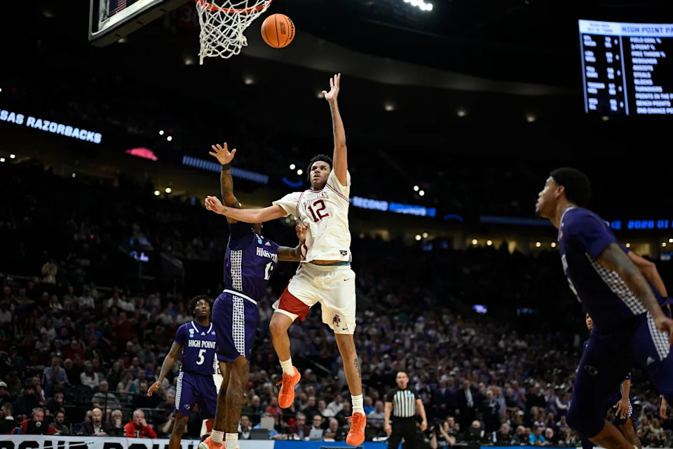 Mar 21, 2026; Portland, OR, USA; Arkansas Razorbacks forward Malique Ewin (12) shoots against High Point Panthers forward Cam’ron Fletcher (11) in the second half during a second round game of the men’s 2026 NCAA Tournament at Moda Center. Mandatory Credit: Troy Wayrynen-Imagn Images