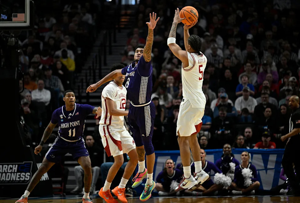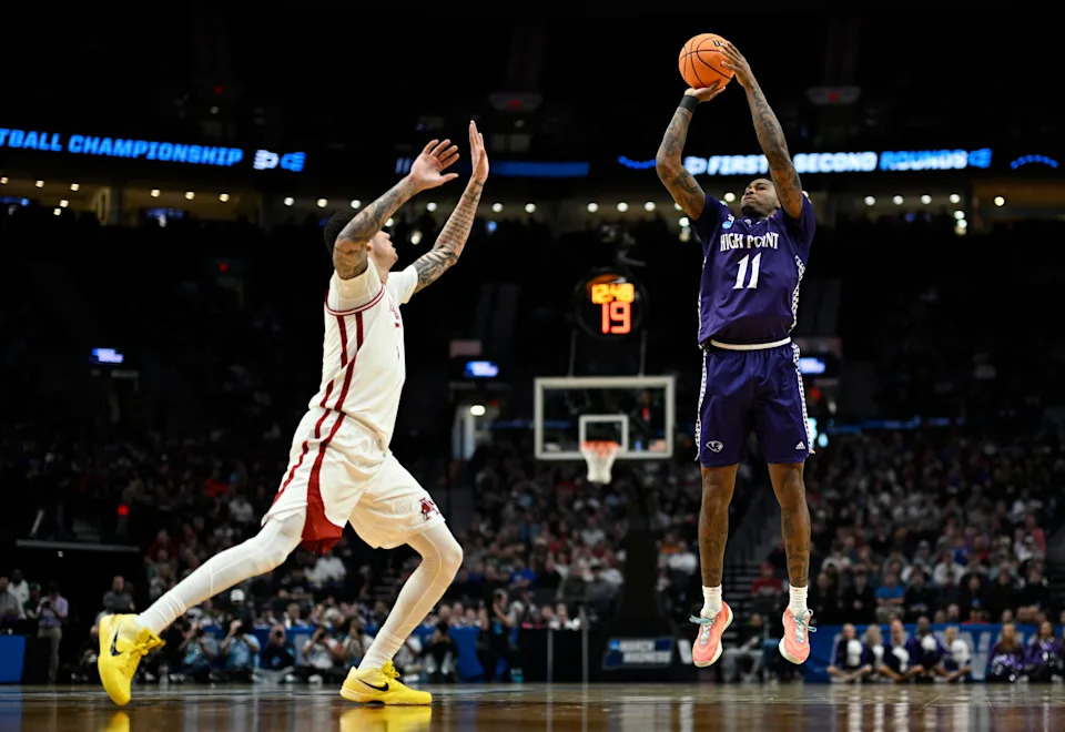 Mar 21, 2026; Portland, OR, USA; High Point Panthers guard Rob Martin (3) shoots against Arkansas Razorbacks guard Darius Acuff Jr. (5) in the second half during a second round game of the men’s 2026 NCAA Tournament at Moda Center. Mandatory Credit: Troy Wayrynen-Imagn Images