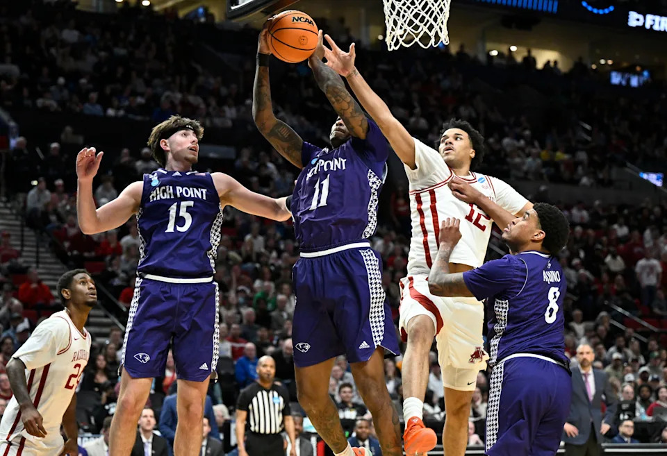 Mar 21, 2026; Portland, OR, USA; High Point Panthers forward Cam’ron Fletcher (11) rebounds against Arkansas Razorbacks forward Malique Ewin (12) in the first half during a second round game of the men’s 2026 NCAA Tournament at Moda Center. Mandatory Credit: Craig Strobeck-Imagn Images