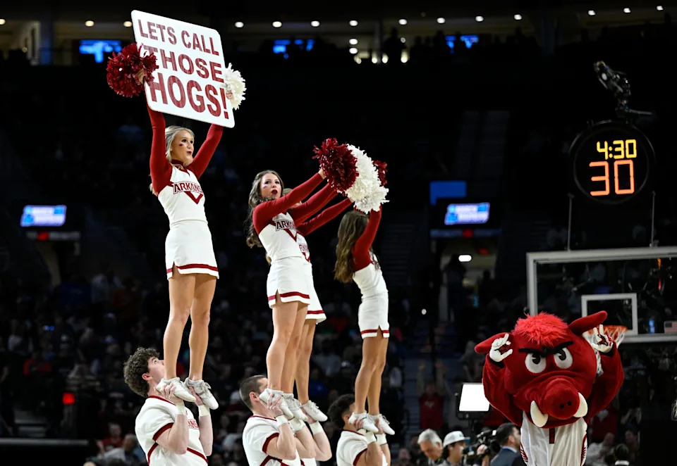 Mar 21, 2026; Portland, OR, USA; Arkansas Razorbacks cheerleaders in the first half against the High Point Panthers during a second round game of the men’s 2026 NCAA Tournament at Moda Center. Mandatory Credit: Troy Wayrynen-Imagn Images