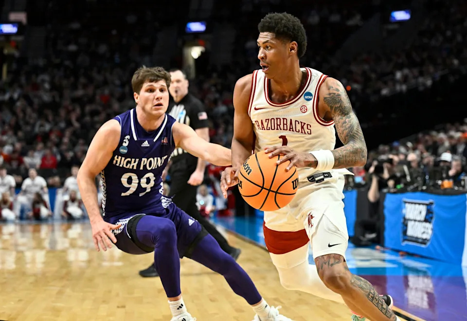 Mar 21, 2026; Portland, OR, USA; Arkansas Razorbacks guard Meleek Thomas (1) drives against High Point Panthers guard Chase Johnston (99) in the first half during a second round game of the men’s 2026 NCAA Tournament at Moda Center. Mandatory Credit: Craig Strobeck-Imagn Images
