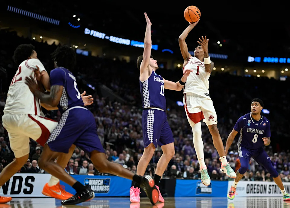 Mar 21, 2026; Portland, OR, USA; Arkansas Razorbacks guard Meleek Thomas (1) shoots against High Point Panthers forward Braden Hausen (15) in the second half during a second round game of the men’s 2026 NCAA Tournament at Moda Center. Mandatory Credit: Troy Wayrynen-Imagn Images