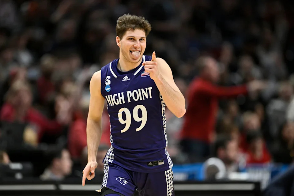 Mar 21, 2026; Portland, OR, USA; High Point Panthers guard Chase Johnston (99) reacts after a basket in the first half against the Arkansas Razorbacks during a second round game of the men’s 2026 NCAA Tournament at Moda Center. Mandatory Credit: Craig Strobeck-Imagn Images