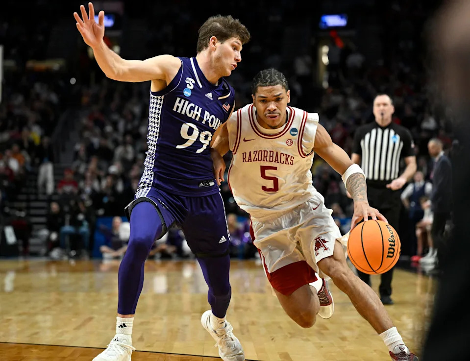 Mar 21, 2026; Portland, OR, USA; Arkansas Razorbacks guard Darius Acuff Jr. (5) drives against High Point Panthers guard Rob Martin (3) in the second half during a second round game of the men’s 2026 NCAA Tournament at Moda Center. Mandatory Credit: Troy Wayrynen-Imagn Images