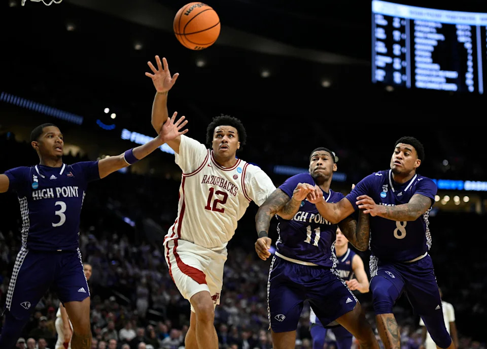 Mar 21, 2026; Portland, OR, USA; Arkansas Razorbacks forward Malique Ewin (12) chases a loose ball against High Point Panthers guard Rob Martin (3), forward Cam’ron Fletcher (11) and forward Owen Aquino (8) in the second half during a second round game of the men’s 2026 NCAA Tournament at Moda Center. Mandatory Credit: Troy Wayrynen-Imagn Images