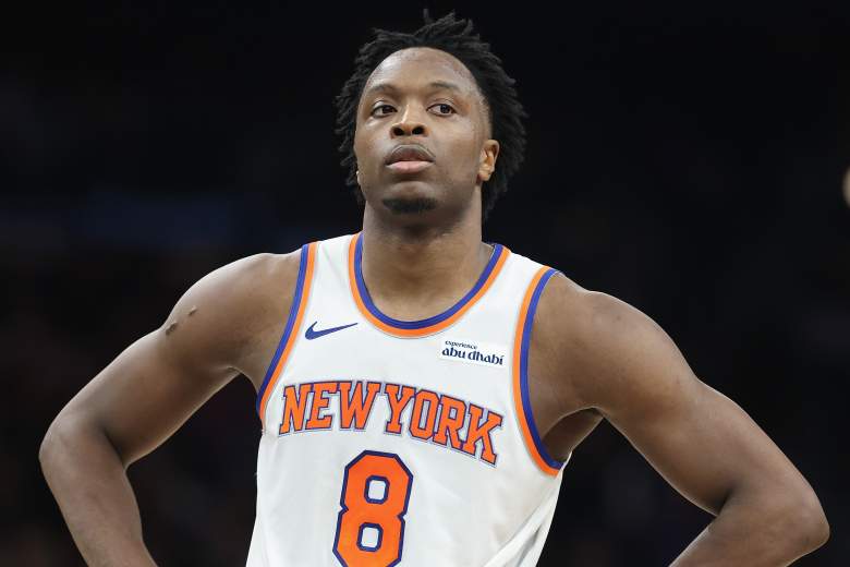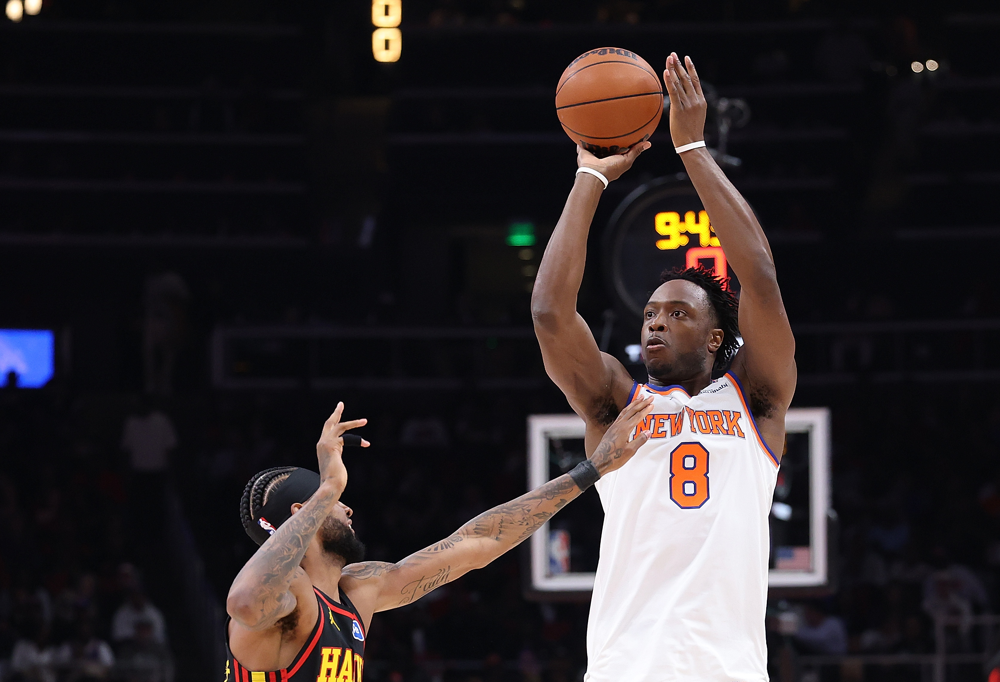 GettyATLANTA, GEORGIA – APRIL 06: Og Anunoby #8 of the New York Knicks attempts a shot against Nickeil Alexander-Walker #7 of the Atlanta Hawks. (Photo by Kevin C. Cox/Getty Images)