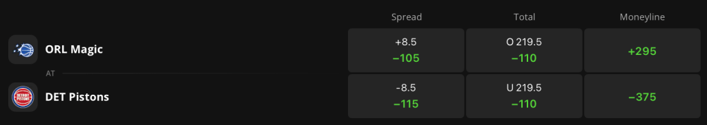 Looking at the odds for the Game 1 matchup, the Pistons enter as 8.5-point favorites and hold -375 odds of winning outright on DraftKings Sportsbook. The Magic hold +260 odds of winning outright, with the game total set at 219.5.