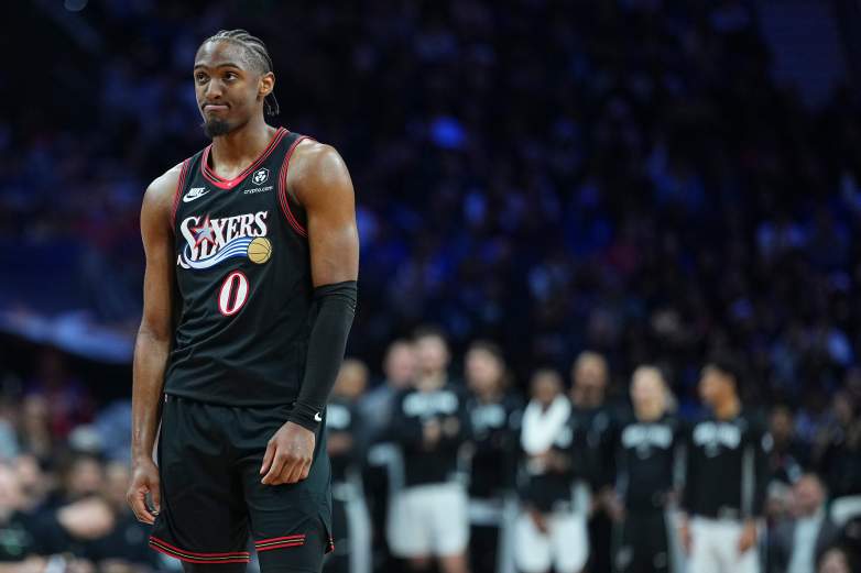 PHILADELPHIA, PENNSYLVANIA – MARCH 3: Tyrese Maxey #0 of the Philadelphia 76ers looks on against the San Antonio Spurs in the second quarter at Xfinity Mobile Arena on March 3, 2026 in Philadelphia, Pennsylvania. NOTE TO USER: User expressly acknowledges and agrees that, by downloading and or using this photograph, User is consenting to the terms and conditions of the Getty Images License Agreement. (Photo by Mitchell Leff/Getty Images)
