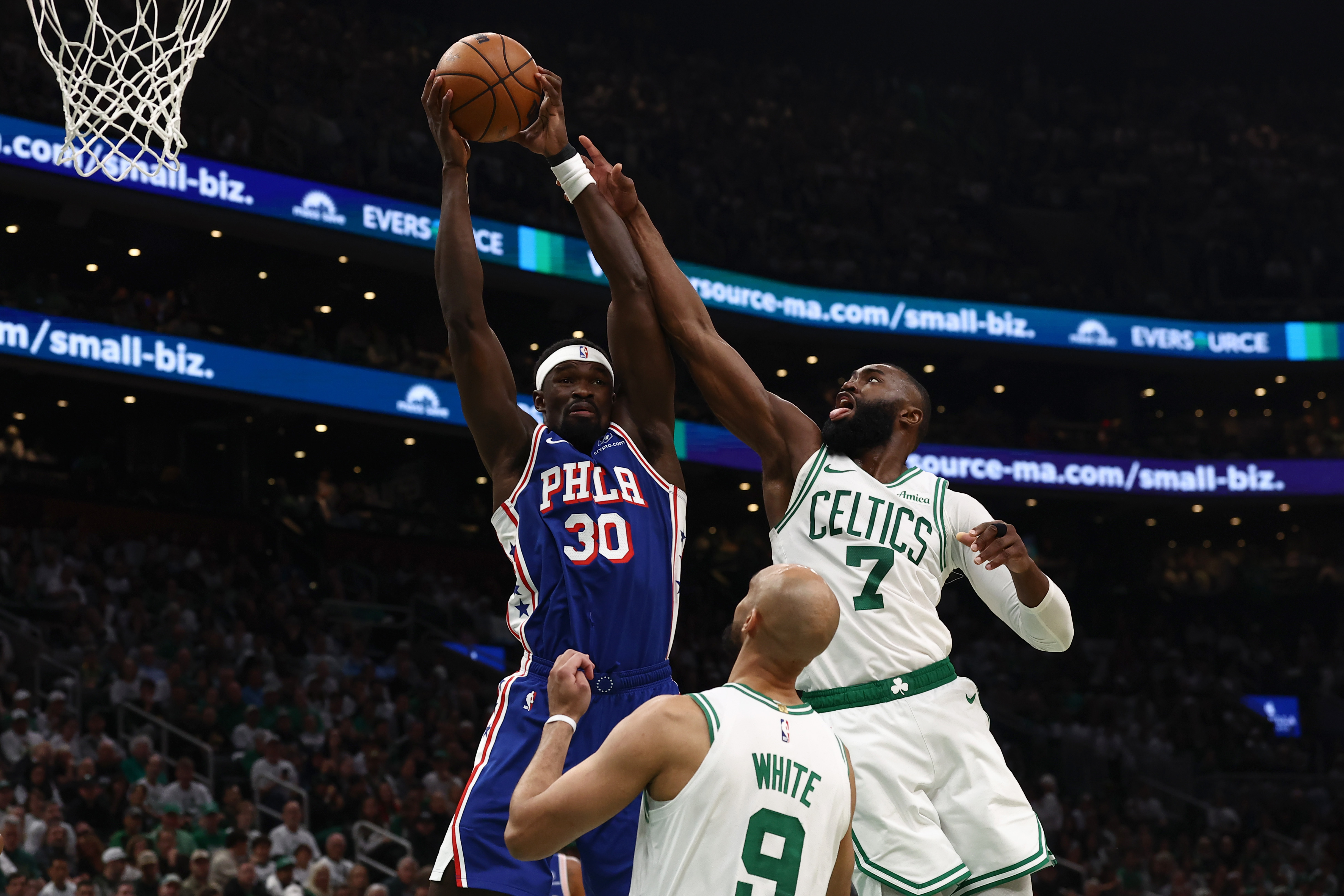 GettyBOSTON, MA – APRIL 19: Adem Bona #30 of the Philadelphia 76ers grabs a rebound against Jaylen Brown #7 of the Boston Celtics during the second quarter of Game One of the Eastern Conference First Round NBA Playoffs at TD Garden on April 19, 2026 in Boston, Massachusetts. (Photo By Winslow Townson/Getty Images)